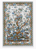 Il motivo dell'Albero della Vita è impreziosito da dettagli botanici raffinati: fiori azzurri, rami intrecciati e uccelli che danzano tra le fronde, creando una composizione armoniosa nei toni del marrone, azzurro e bianco. Ogni elemento racconta una storia di natura e rinascita.